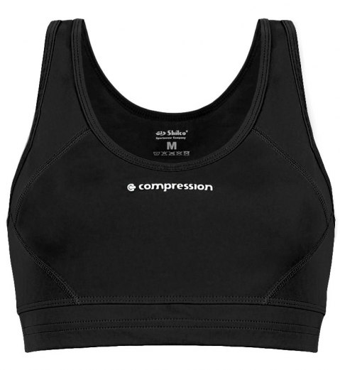 Топ женский из высокоэластичного трикотажа. Подкладка в области груди из вискозного материала белого цвета, предполагает использование изделия в прямом контакте с телом. Изделие плотного прилегания, комфортное при активном движении. Модель на широких бретелях, с окантовкой из основного материала. Низ на притачной манжете с эластичной тесьмой 3 см. Рельефы выполнены высокоэластичным плоским швом. Принт «compression» в области груди на передней половинке изделия.